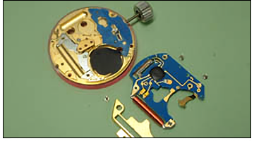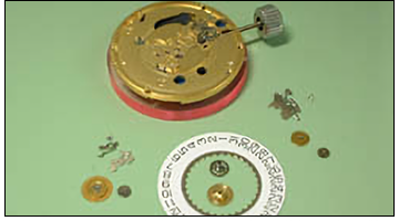 分解掃除(クオーツ) クオーツ腕時計の分解掃除依頼も実は年々増えています 電気で動くクオーツ腕時計でも針や歯車を使用するアナログタイプの時計には分解掃除(オーバーホール)が必要です(電子回路で動くデジタルタイプは分解掃除不要です) 分解掃除[クオーツ腕時計] → 組立工程へ 分解工程 部品の洗浄が済んだら組み立て。リューズ周辺の組み立てと注油を行います。 分解を始めます。時計本体からベルトを取り外します。金属バンドの場合は超音波洗浄器でクリーニングします。 裏ブタを外します。裏ブタとムーブメントの間に磁気を防ぐ耐磁板が装備されています。 電池を取り外して電圧を測定します。 リューズと中枠をはずして、時計ケースからムーブメントを取り外せる状態にします。 時計ケースからムーブメントを取り外します。ケースは洗浄を行い、必要に応じて研磨して傷を取り除きます。 専用の工具で針を取り外します。文字盤や針に傷をつけないよう細心の注意が必要です。 針が抜けたら文字盤を外します。文字盤とムーブメントは金属のピンで固定されていますのでロックを解除します。 文字盤を外すとカレンダー板とカレンダーを動作させる為の機構が現れます。 カレンダー機構を分解しました。 輪列側も分解します。コイルの抵抗値を検査してからコイルブロックをはずします。回路と一体式です。 輪列部分を分解します。輪列受けをはずしステップローターと各歯車、ストップレバーを外します。 リューズ、マキシン周辺を分解します。 各部品を自動洗浄器にかけます。 ページ先頭に戻る 組立工程 部品の洗浄が済んだら組み立て。リューズ周辺の組み立てと注油を行います。 輪列を組み立てます。ステップローター、2番車、3番車、中間車を輪列受けで固定し、穴石にオイルを注入します。 電子回路の組み立て。回路基盤やコイルを所定の位置に取り付けます。コイルの抵抗値等を測定します。 摩擦車にも注油。組み立てた後から注油できない部品には予めオイルを注してから組み付けます。 カレンダー側の組み立て。ムーブメントの文字盤側、カレンダー機構の組み立てです。 組みあがったカレンダー機構にも注油。機構の動きが悪いと時計の遅れや止まり、消費電流増加の原因となります。 文字盤を取り付けて時針を乗せていきます。日付変更のタイミングと同調するように位置決めします。 時針と分針が12時位置で会うように、秒針はインデックスと重なるように、分針と秒針を取り付けます。 時計ケースにムーブメントを収めて、中枠、リューズを取り付け、防水パッキンに注油しフタを閉めます。 測定器で時間精度(1日の誤差)を測り、防水テスト、ランニングテスト等の検査を経て完了です。 ページ先頭に戻る 一般品から高級ブランド品まで。 腕時計修理・電池交換は実績ある“ODAKA”にお任せください ! ◎フォーム からもお問合せいただけます(24時間受付)